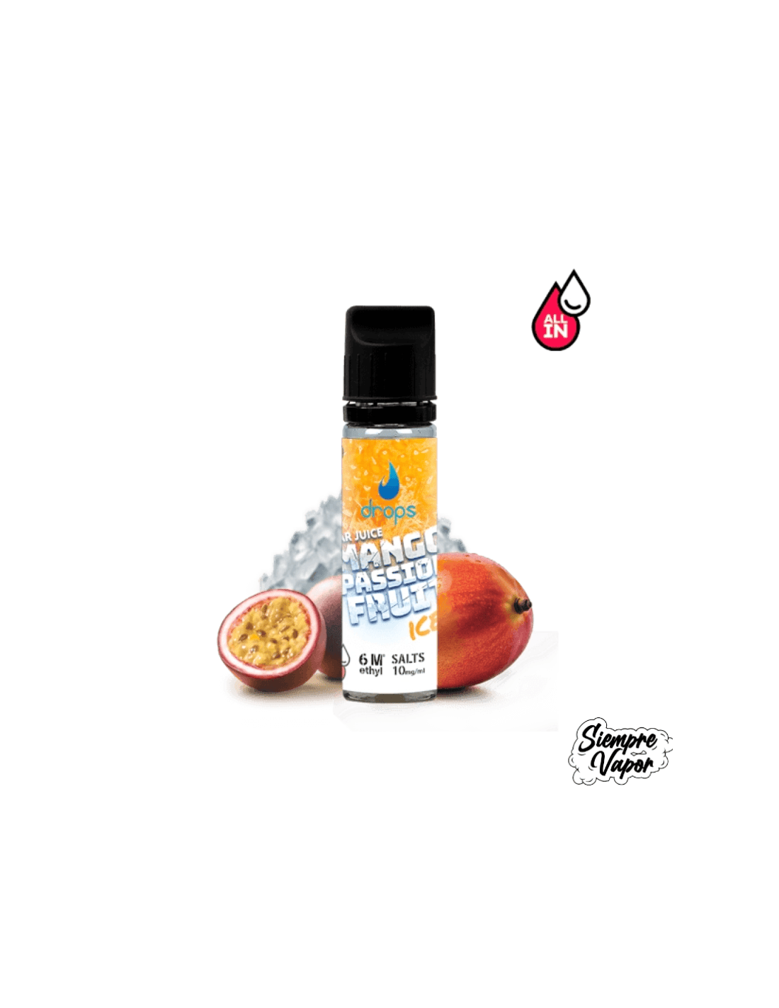 Drops All In Bar Juice Mango Passion Fruit Ice 10ml - Drops ofrece una combinación tropical exquisita, donde el dulzor del mango maduro se fusiona con la acidez exótica del maracuyá, todo envuelto en una intensa frescura helada.