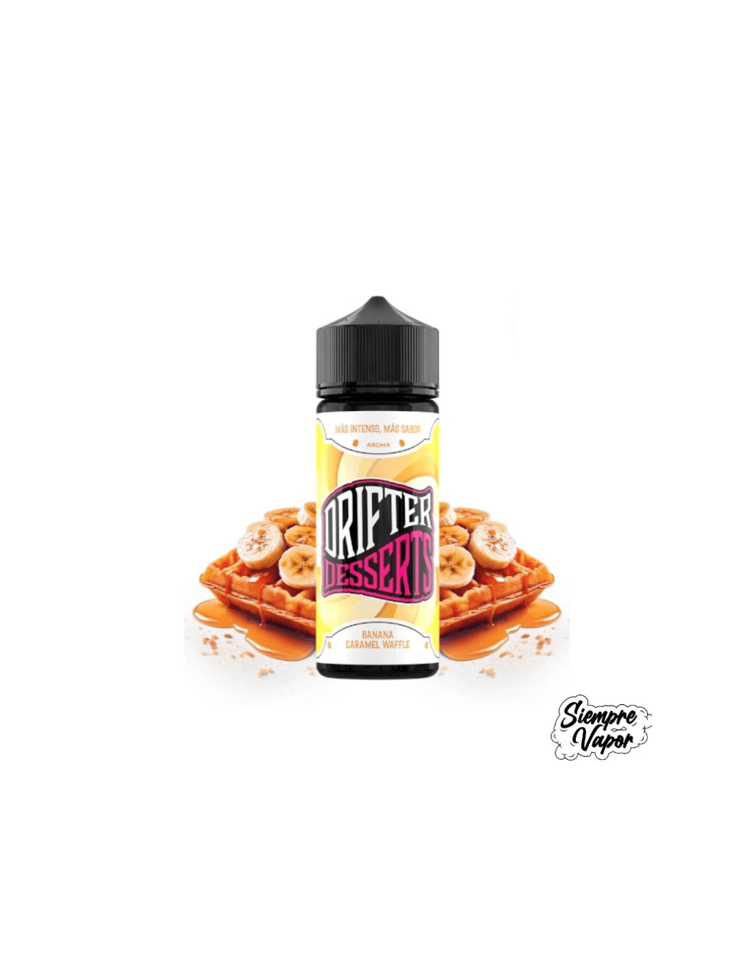 Aroma Drifter Desserts Banana Caramel Waffle es un Longfill premium de 24ml que ofrece una deliciosa experiencia de vapeo con un sabor irresistible a gofre crujiente cubierto de plátano maduro y caramelo. Este concentrado te permite personalizar tu e-líquido añadiendo base PG/VG y nicotina según tu gusto, para una mezcla dulce, suave y afrutada con un toque reconfortante.