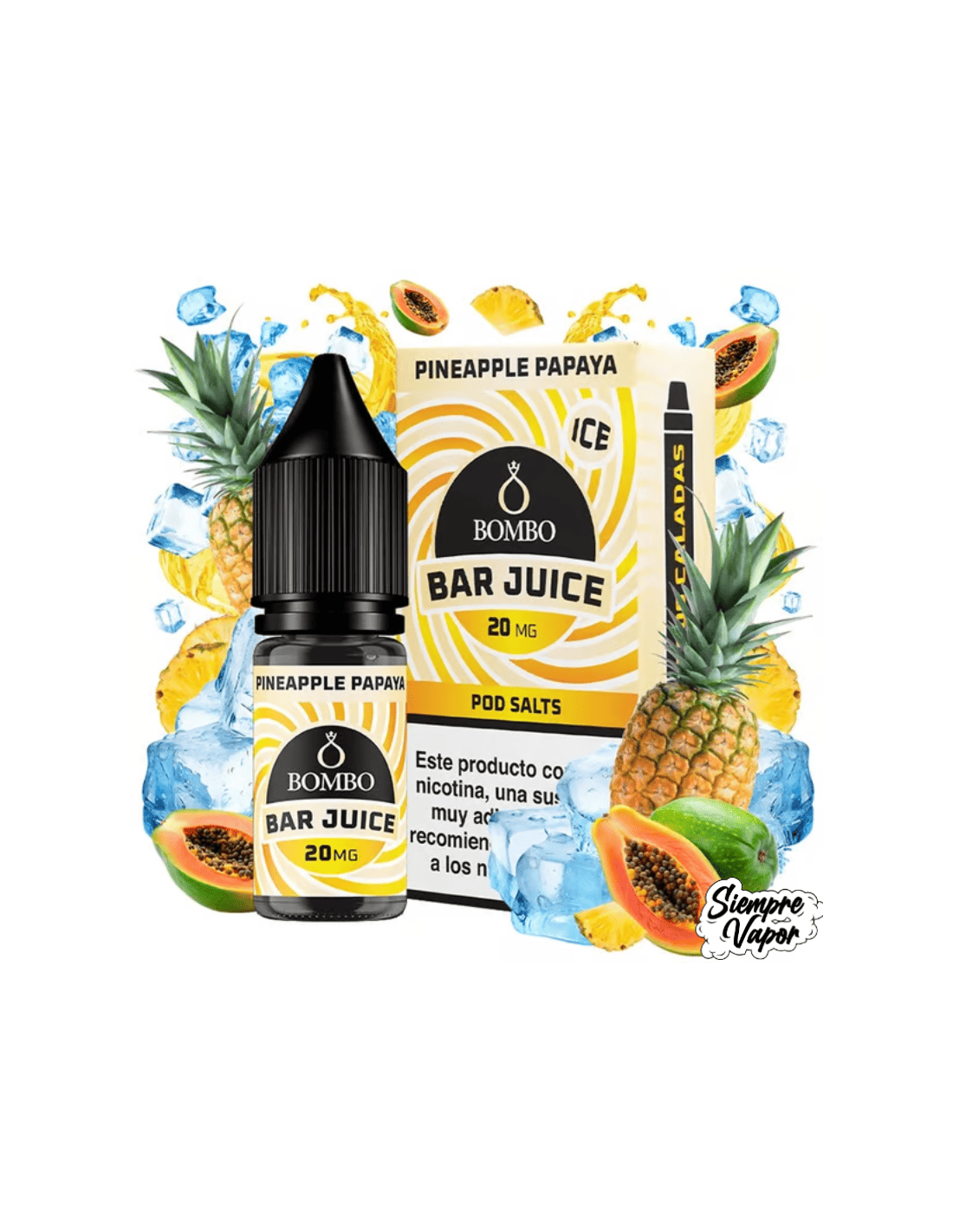 El Pineapple Papaya Ice Sales 10ml de Bombo es una deliciosa y sabrosa piña tropical recién cortada y servida acompañada de exótica papaya sobre un efecto helado creando un mix ideal para vapear.